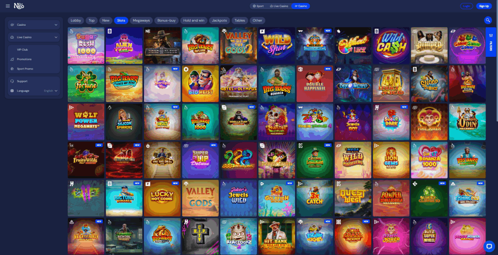 El área de casino es donde Slotneo brilla con luz propia. Nuestra review de Slotneo.com confirma que su biblioteca de juegos es una de las más extensas que hemos evaluado. Alberga miles de títulos, incluyendo la última generación de tragamonedas de los proveedores más solicitados a nivel global (como Red Tiger, Yggdrasil y otros líderes). La variedad temática, los jackpots progresivos y los juegos exclusivos aseguran que ningún jugador se quede sin opciones.